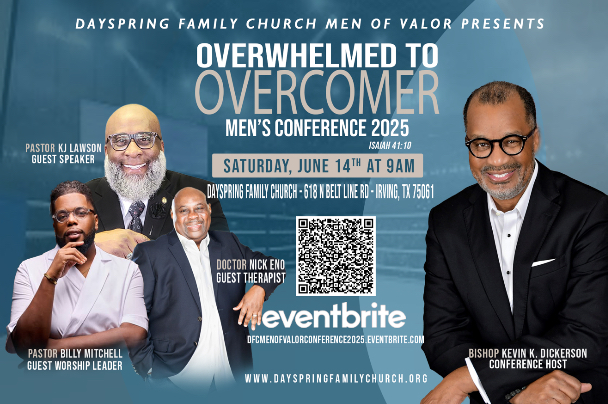 Join us for the Men of Valor Conference 2025: “Overwhelmed to Overcomer” on Saturday, June 14th from 9:00 AM – 1:00 PM at Dayspring Family Church, 618 N. Belly Line Rd, Irving, TX!